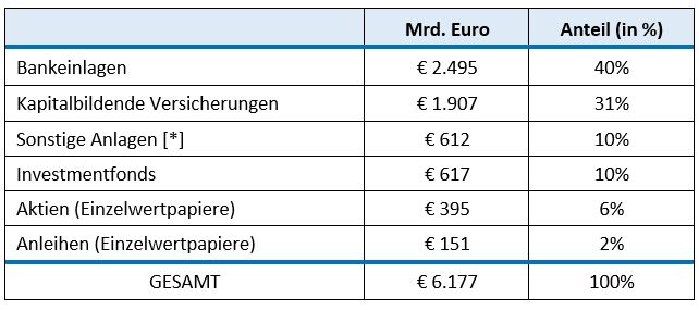 Quelle: DZ Bank. ► [*] Hierzu gehören Ansprüche an betriebliche Altersvorsorgeeinrichtungen sowie Zertifikate und andere Wertpapiere, die keine Aktien oder Anleihen sind. ► Nicht in dieser Tabelle enthalten sind illiquide Vermögensanlagen wie Direktinvestments in Immobilien, nicht-börsennotierte Unternehmensbeteiligungen und Ansprüche an die gesetzliche Rentenversicherung oder äquivalente Versorgungswerke. ► Rechnet man „Investmentfonds“ hälftig den Asset-Klassen Aktien und Anleihen zu, investieren die Deutschen sechsmal so viel in renditearme und risikoreiche Anlagen (Bankeinlagen und Lebensversicherungen) wie in die ertragreichste aller Asset-Klassen: Aktien.